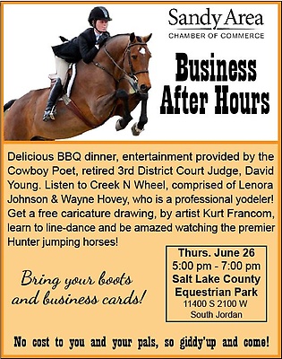 Delicious BBQ dinner, entertainment provided by the Cowboy Poet, retired 3rd District Court Judge, David Young. Listen to Creek N Wheel, comprised of Lenora Johnson & Wayne Hovey, who is a professional yodeler! Get a free caricature drawing, by artist Kurt Francom, learn to line-dance and be amazed watching the premier Hunter jumping horses!